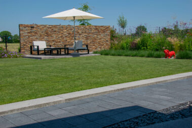- Verharding: Beton- en gebakken stenen, natuursteen of keramische tegels, afwatering en halfverhardingen